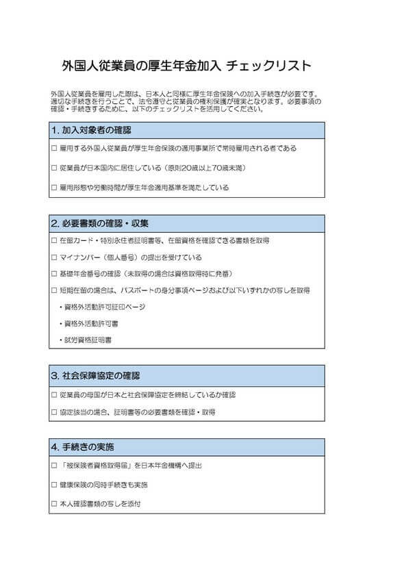 外国人従業員の、厚生年金加入に関する事項をまとめたチェックリストです。必要な確認項目をリスト形式で簡単にチェックすることができます。