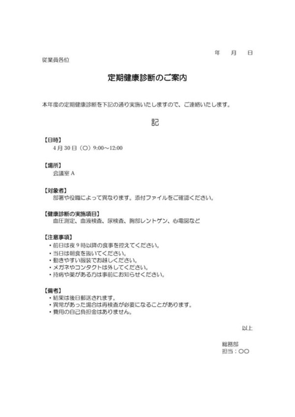 従業員へ健康診断の実施を案内する際に活用できる、ワード形式のテンプレートです。