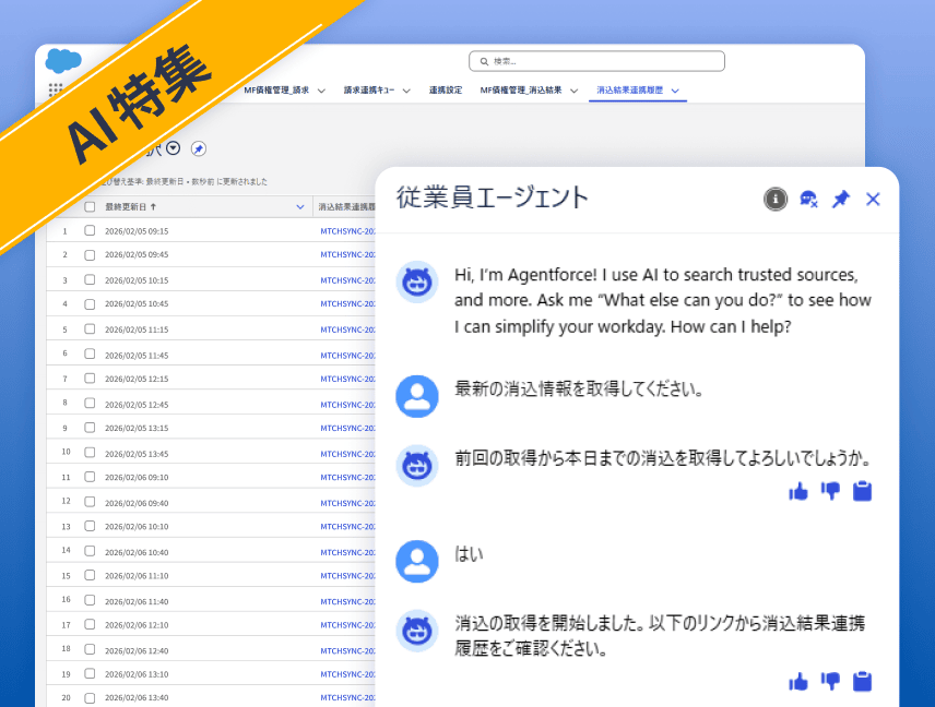 Salesforceから請求データを連携し、消し込んだ結果をSalesforceに反映。営業部門と経理部門間で顧客の請求・入金情報の共有を効率化できます。