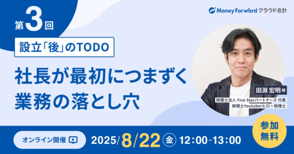 ■動画セミナー配信概要 日時:2025年8月22日(金) 12:00 (※視聴申込み締切は8/22(金)11:00まで) 形式:Zoom ■セミナー内容 登記完了後に社長がやるべき手続きと、つまずきやすいバックオフィス業 … 続きを読む 設立「後」のTODO 社長が最初につまずくバックオフィス業務の落とし穴