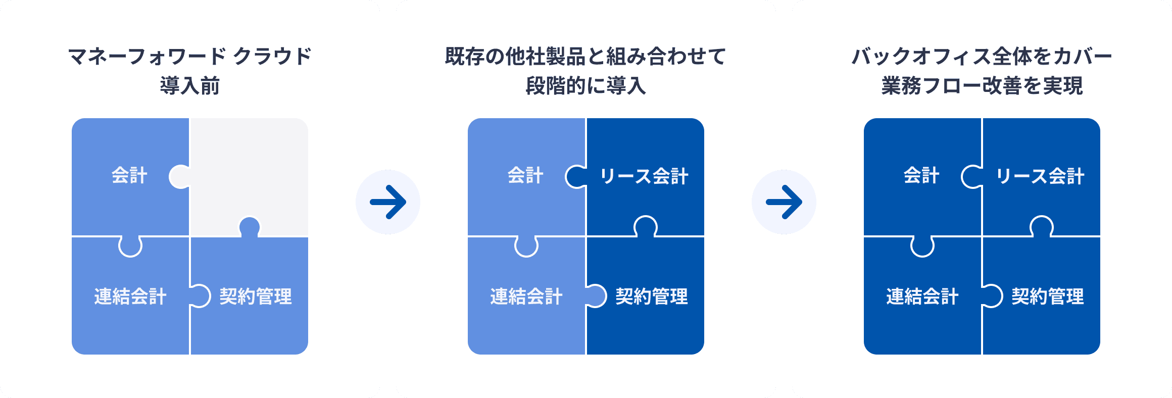 『マネーフォワード クラウドリース会計』は単独で利用することも可能なため、他社の会計システムや固定資産管理システムを利用しながら新リース会計基準に対応する柔軟性を実現します。また、マネーフォワード クラウドは既存の業務フロー/システムに合わせて部分的にサービスを導入し、将来的にバックオフィス全体のクラウド化を目指すといった、段階的なクラウド対応が行えます。