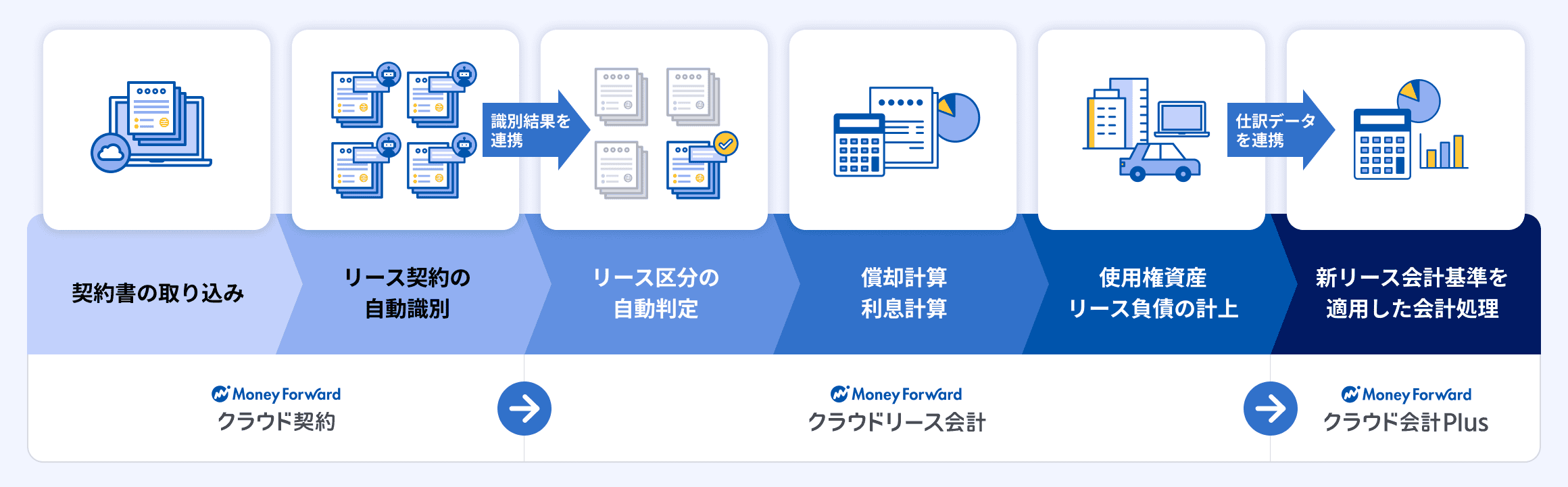 また、リース識別後のデータは「マネーフォワード クラウドリース会計」に連携できるため、リースの識別からオンバランスの判定までスピーディーに行うことができます。