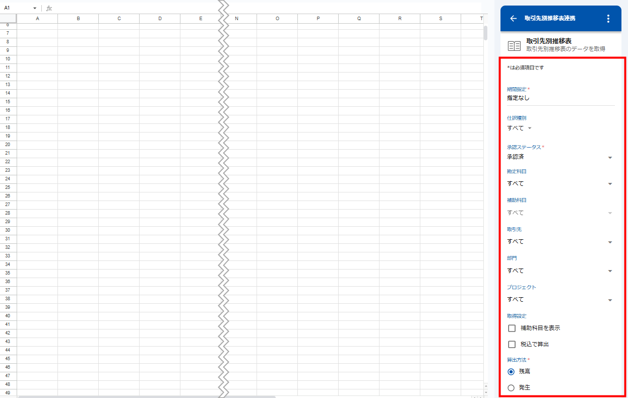 マネーフォワード クラウド会計Plusの事業者との連携が完了すると、スプレッドシートにデータを取得できます。