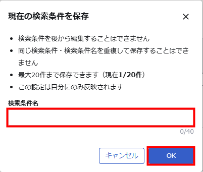 - 「現在の検索条件を保存」画面で「検索条件名」を入力し、「OK」をクリックします。