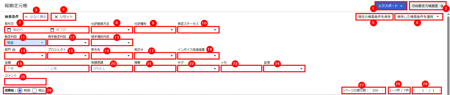 | ㉑ | エクスポート | クリックすると、総勘定元帳をCSV形式またはPDF形式で出力できます。 詳細はこちらの項をご参照ください。 |