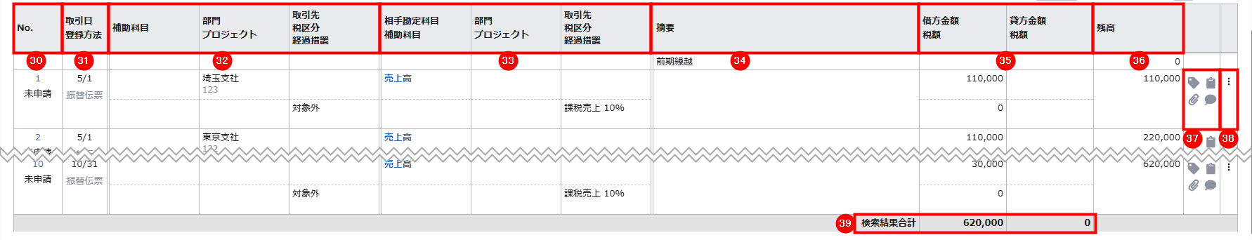 | ㊳ | 縦三点リーダー | クリックすると、「詳細」「編集」「逆仕訳」「複製」「他年度複製」の選択肢が表示されます。 | ㊴ | 検索結果合計 | 最終ページの最下部に検索結果の合計金額が表示されます。 |