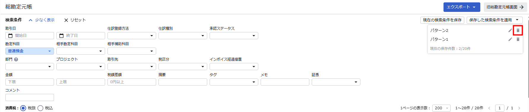 - 表示された検索条件を確認し、削除する検索条件名の右側にあるゴミ箱のアイコンをクリックします。