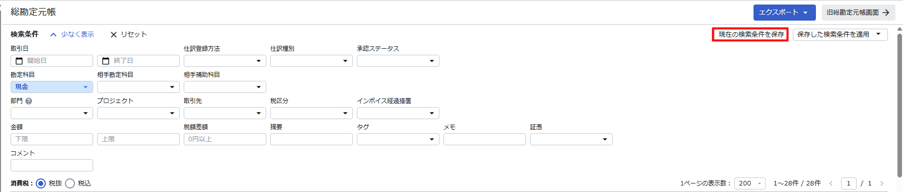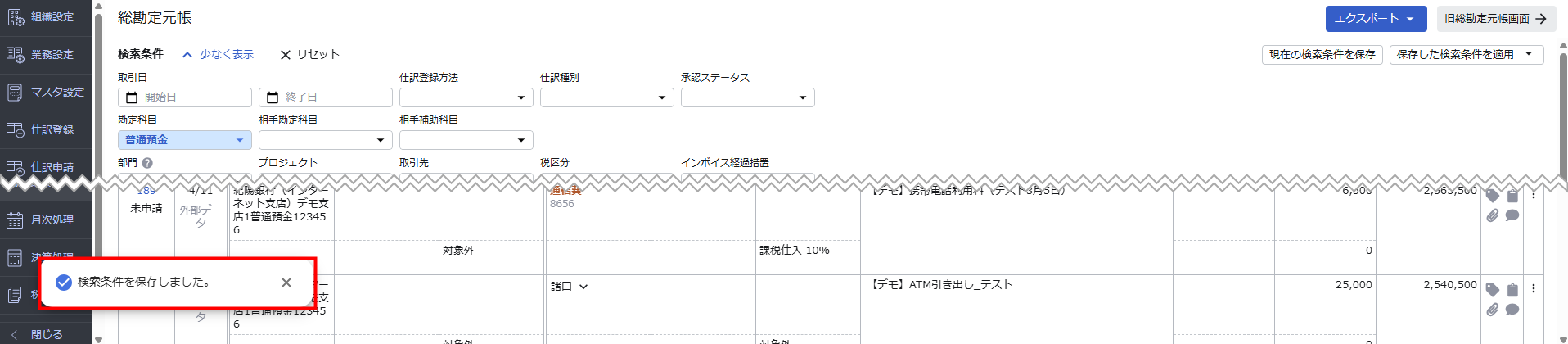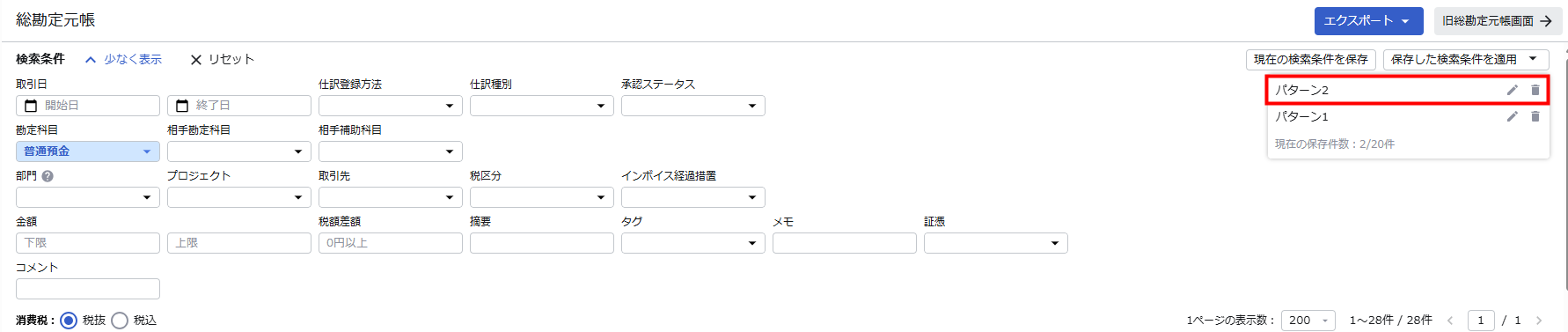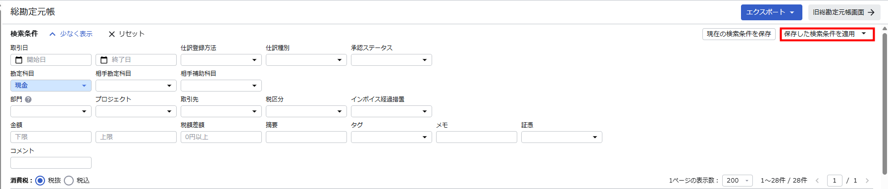 - 「総勘定元帳」画面の検索条件で「保存した検索条件を適用」をクリックします。