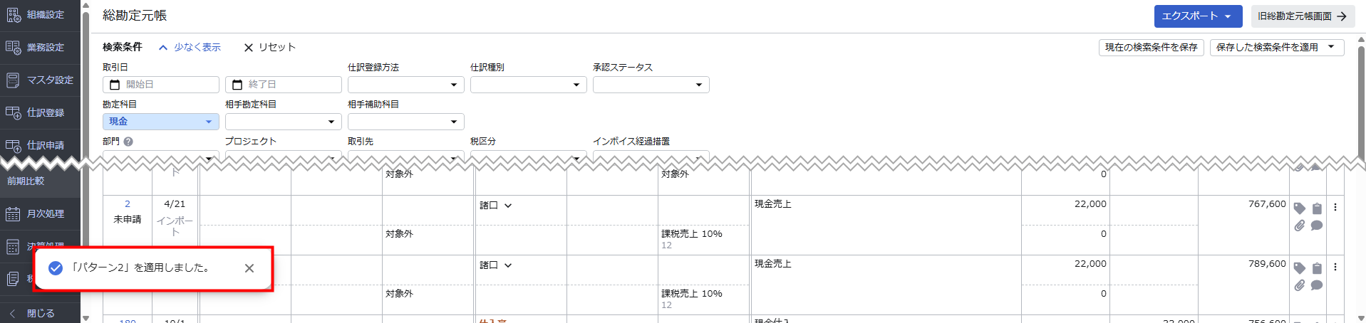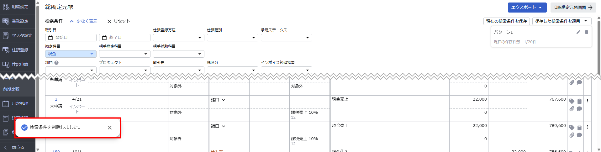 | 5 | 適用した条件に削除された●●が含まれていたため、除外して適用しました。 | 適用した検索条件に削除済みのマスタ(勘定科目・取引先・部門・プロジェクト等)が含まれていることが原因です。 必要に応じて検索条件を編集してください。 |