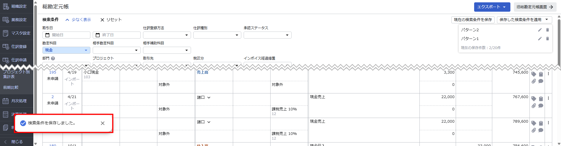 - 画面左下に「検索条件を保存しました。」というメッセージが表示されたことを確認します。