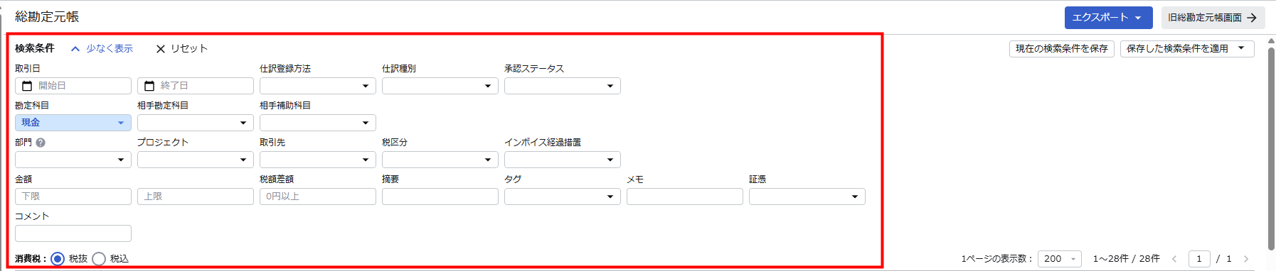 リニューアル後の「総勘定元帳」画面では、前回指定した検索条件が自動で保持されます。