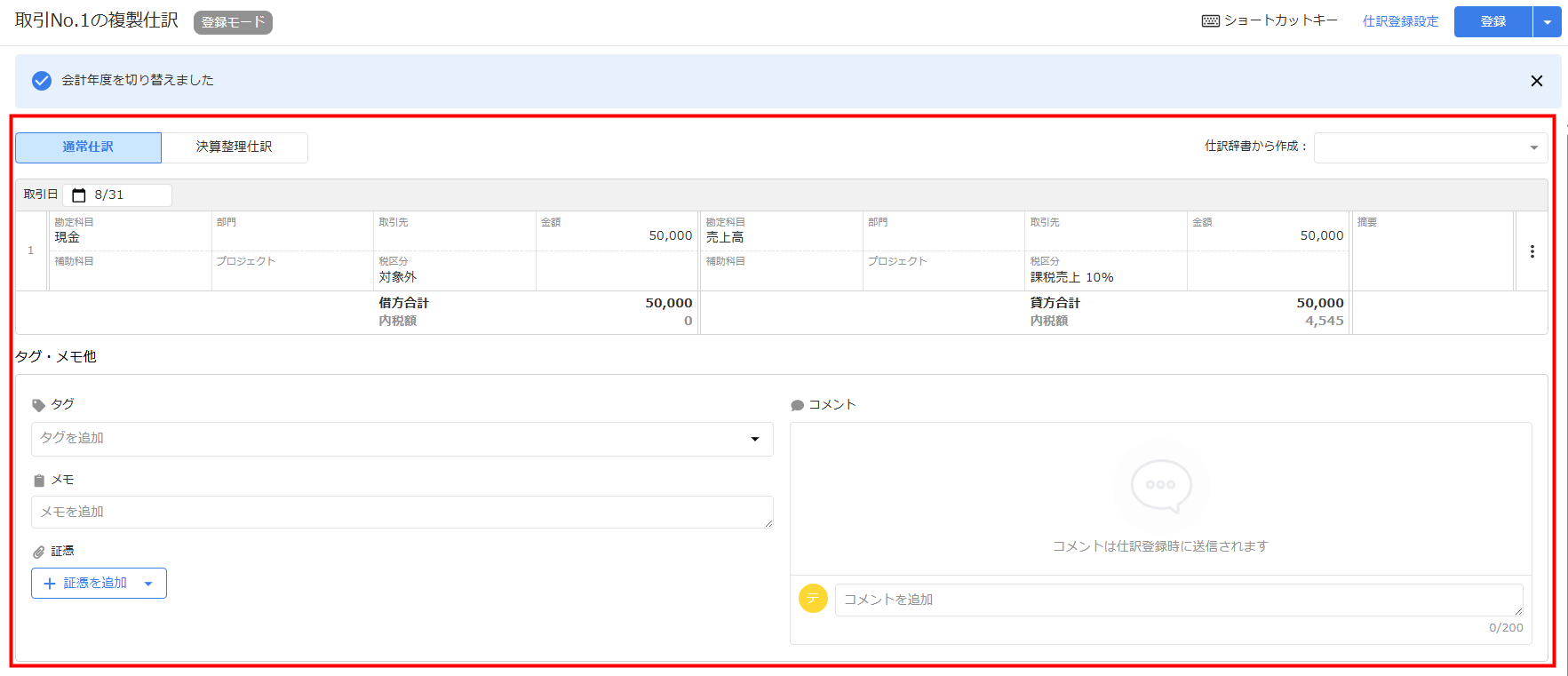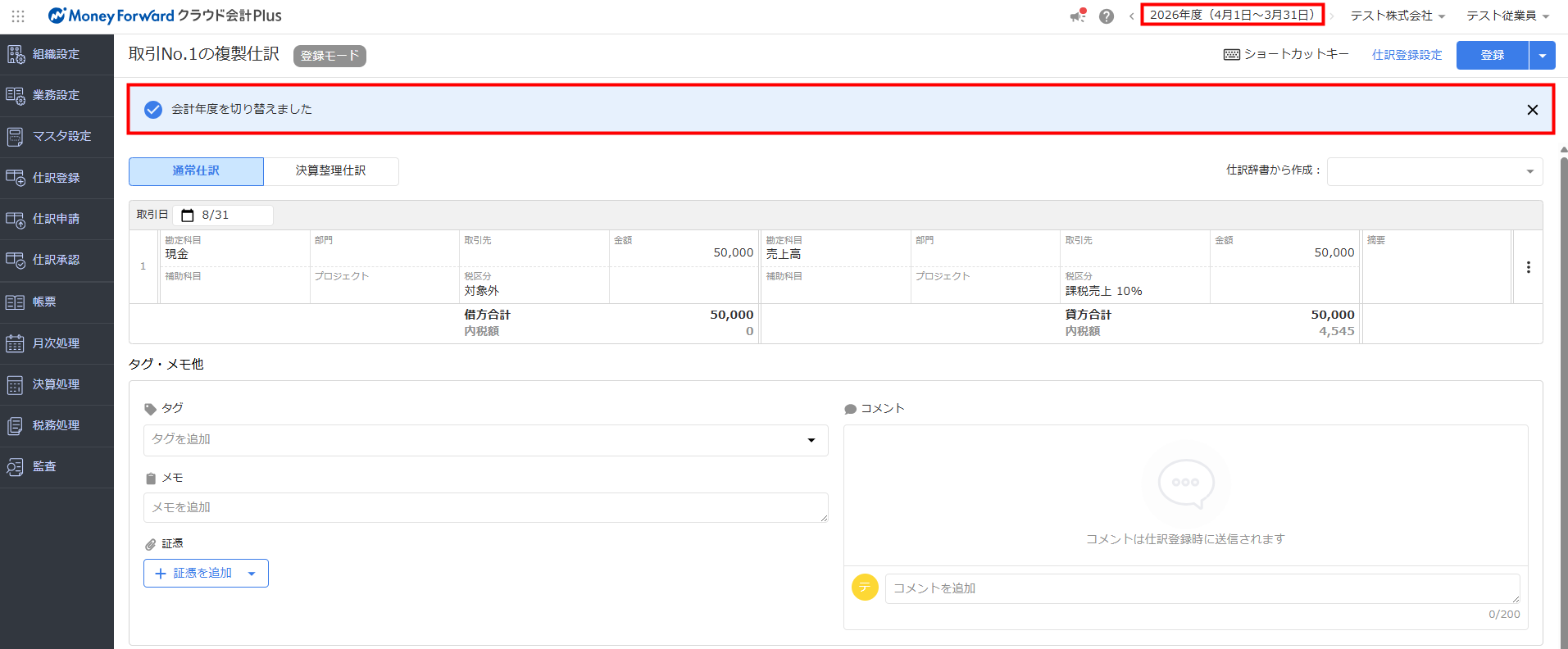 4. 「取引No.●●の複製仕訳」画面で「会計年度を切り替えました」と表示されるため、複製先の会計年度に切り替わっていることを確認します。