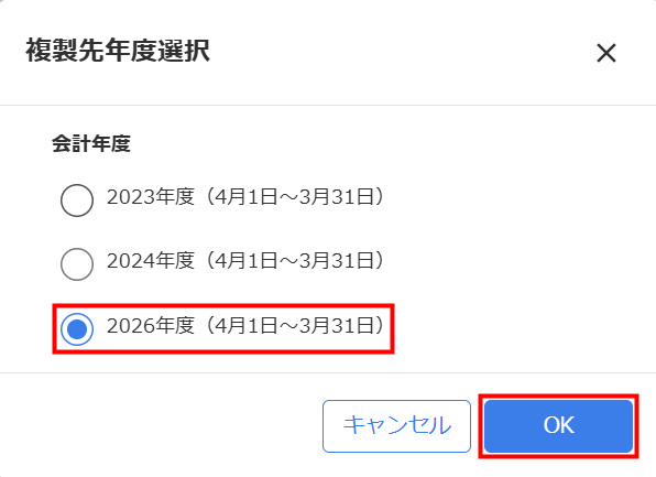 3. 「複製先年度選択」画面で複製先の会計年度を選択し、「OK」をクリックします。