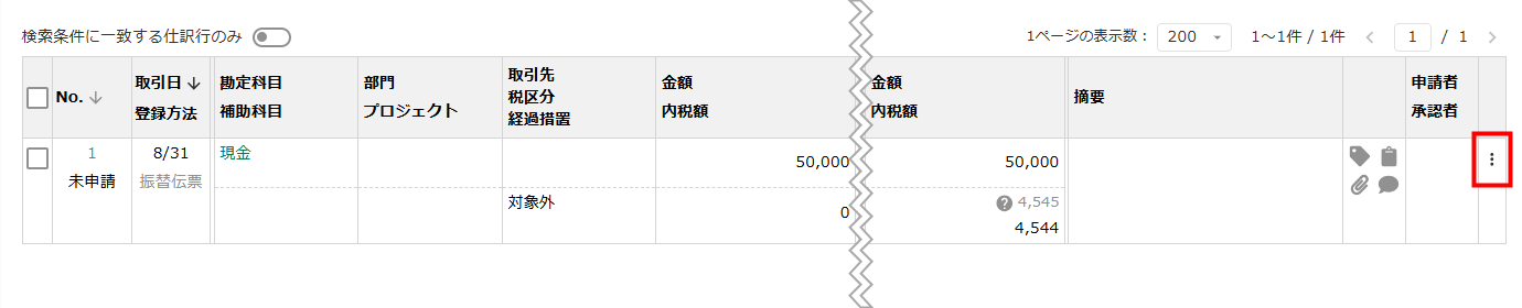 1. 「仕訳帳」画面で複製する仕訳の縦三点リーダーをクリックします。