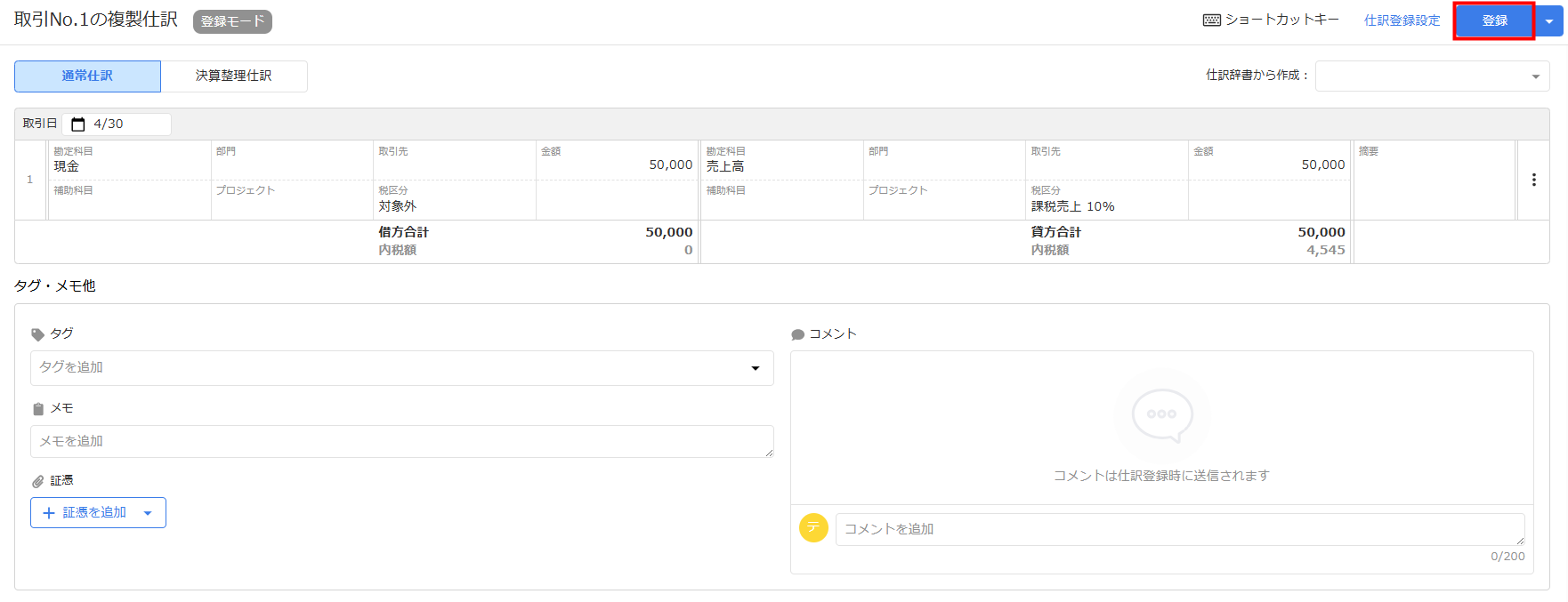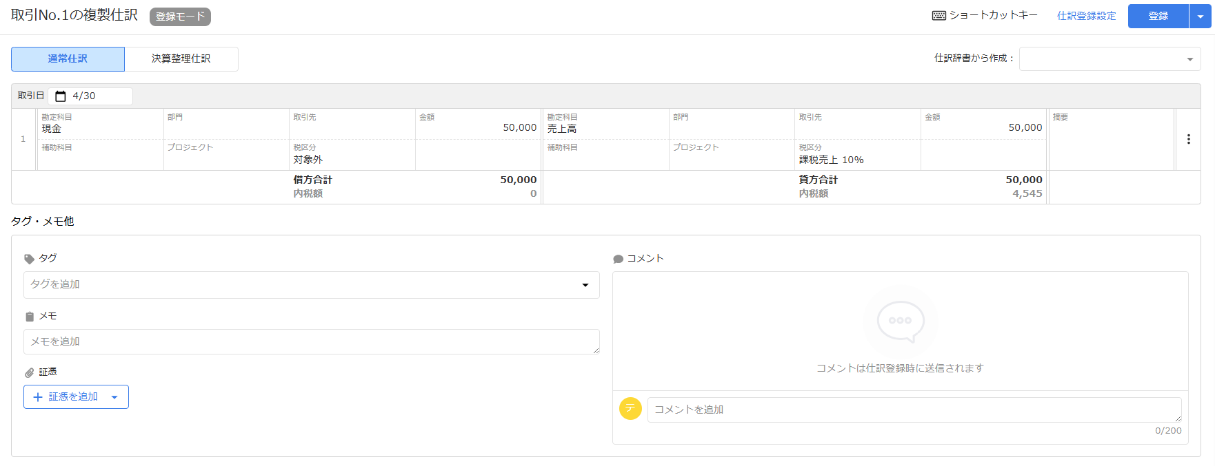 • 複製後の仕訳には、証憑とコメントは引き継がれません。