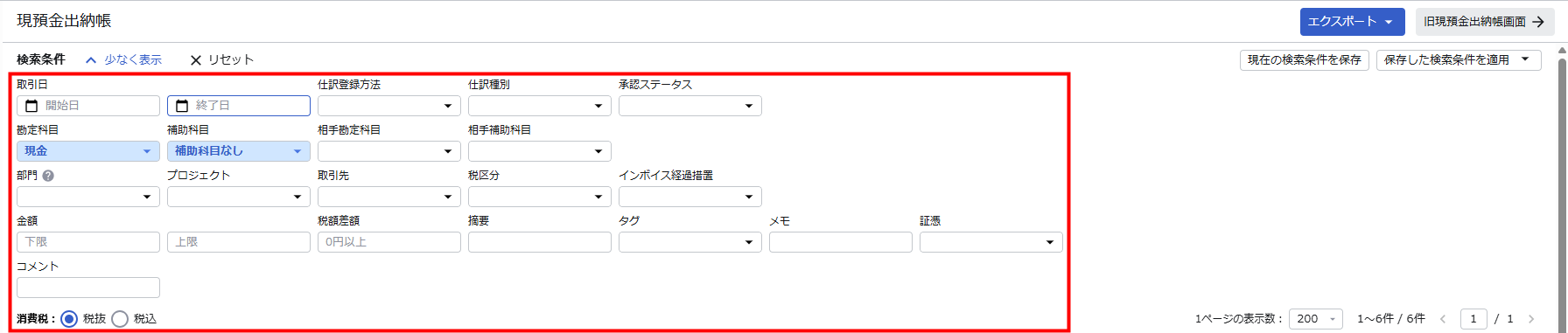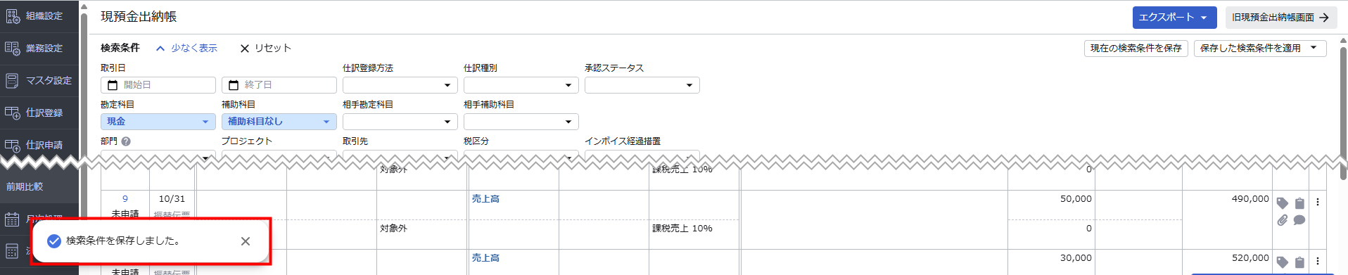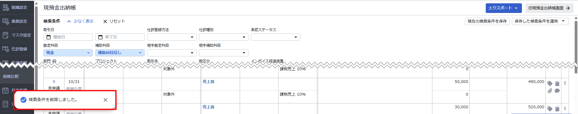 リニューアル後の「現預金出納帳」画面では、前回指定した検索条件が自動で保持されます。