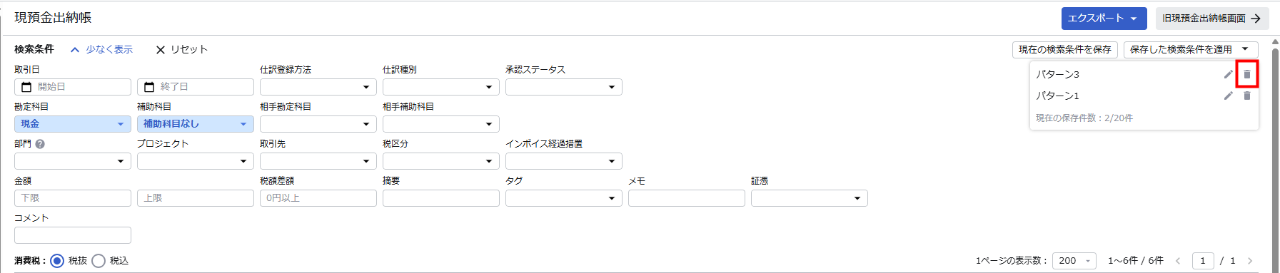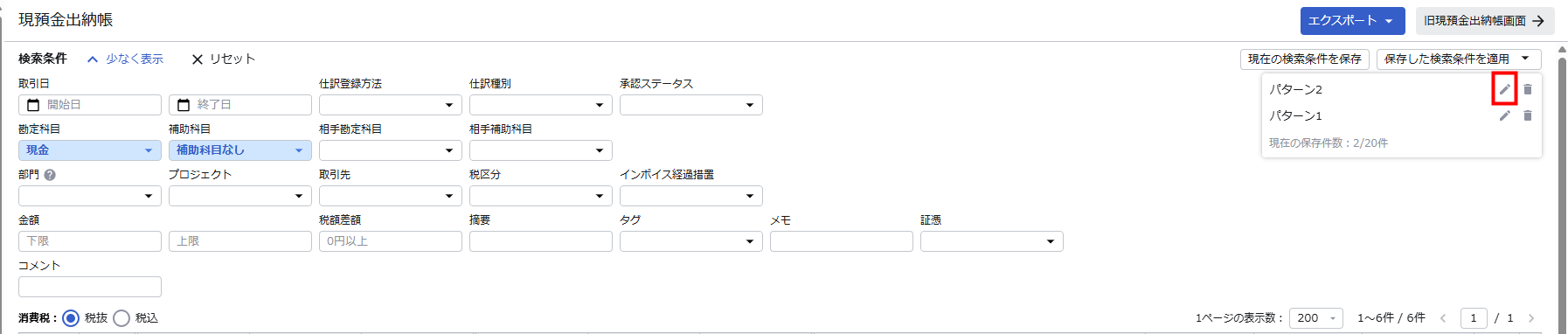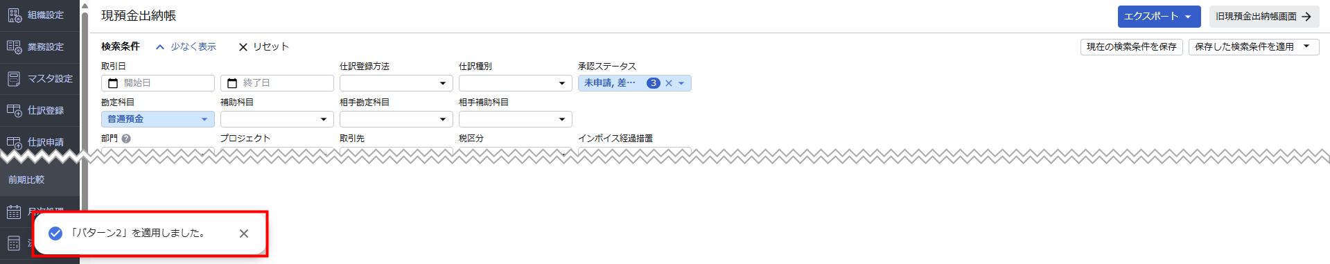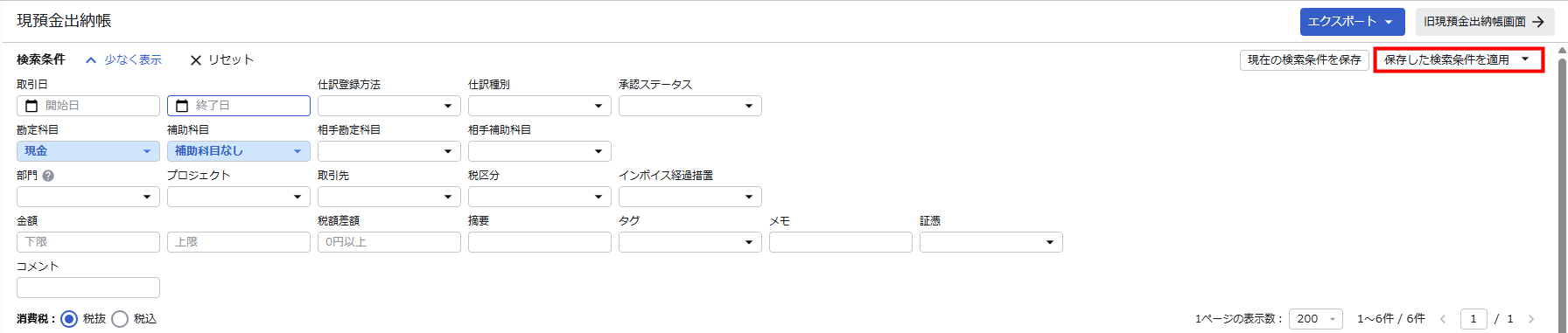 1. 「現預金出納帳」画面の検索条件で「保存した検索条件を適用」をクリックします。