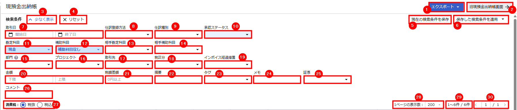 表示件数現預金出納帳の表示件数を「10件」「25件」「50件」「100件」「200件」から選択できます。