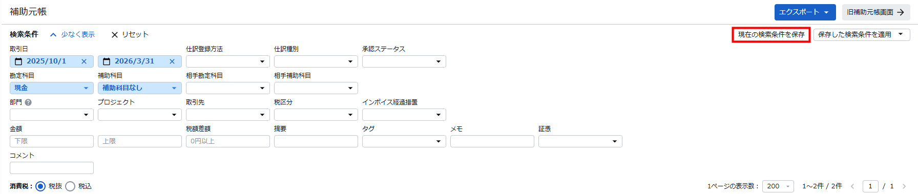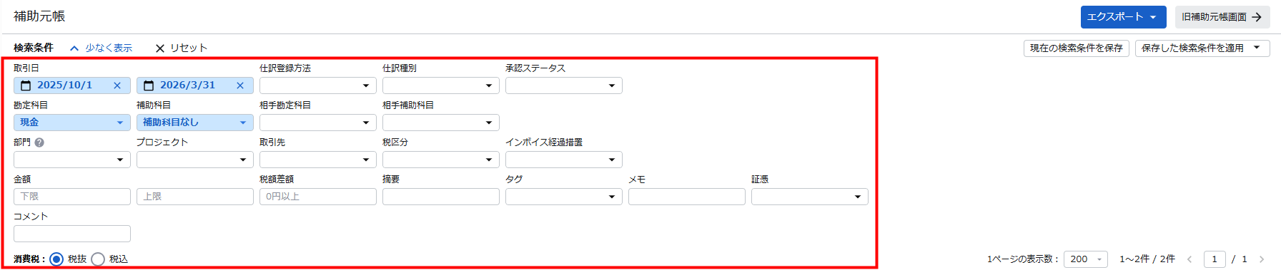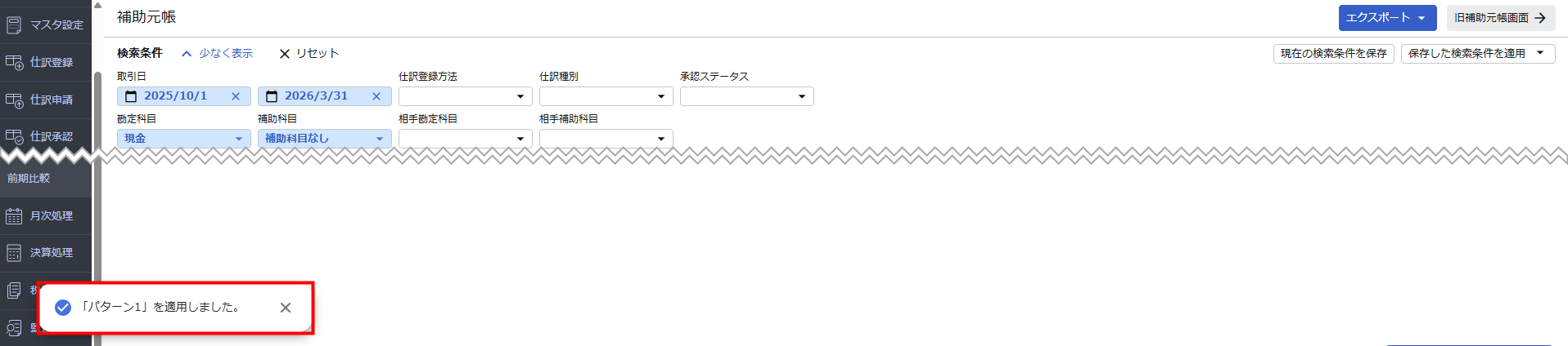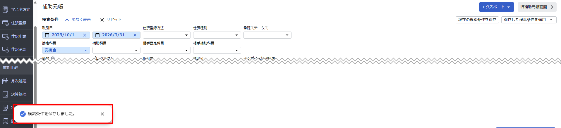 リニューアル後の「補助元帳」画面では、前回指定した検索条件が自動で保持されます。