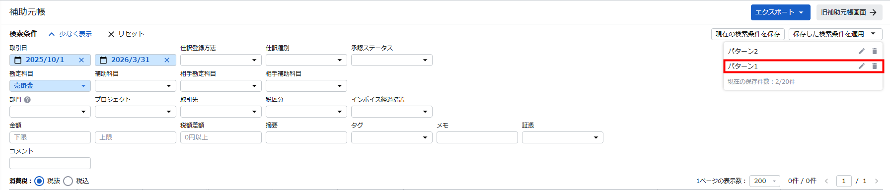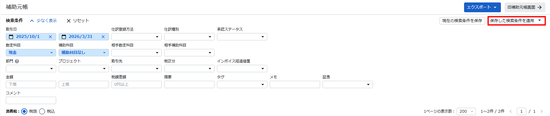 - 「補助元帳」画面の検索条件で「保存した検索条件を適用」をクリックします。
