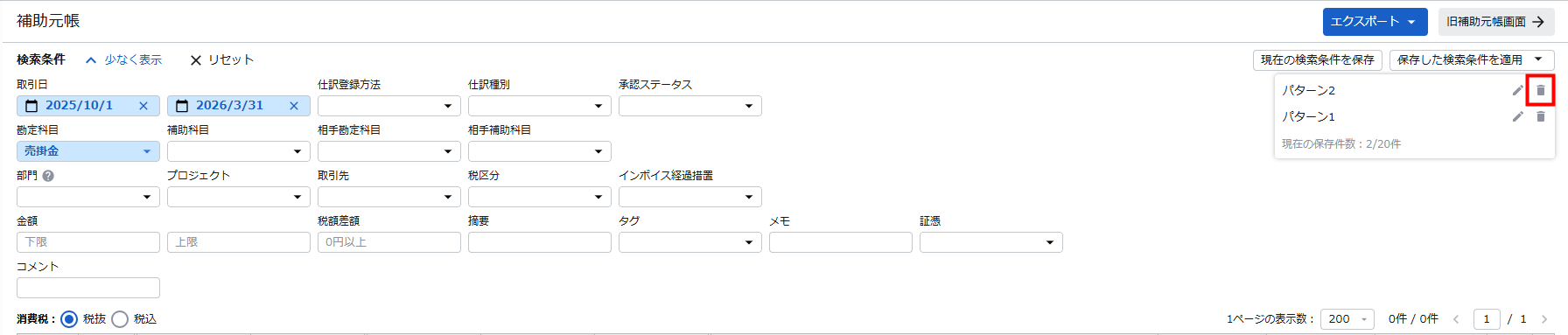 - 表示された検索条件を確認し、削除する検索条件名の右側にあるゴミ箱のアイコンをクリックします。