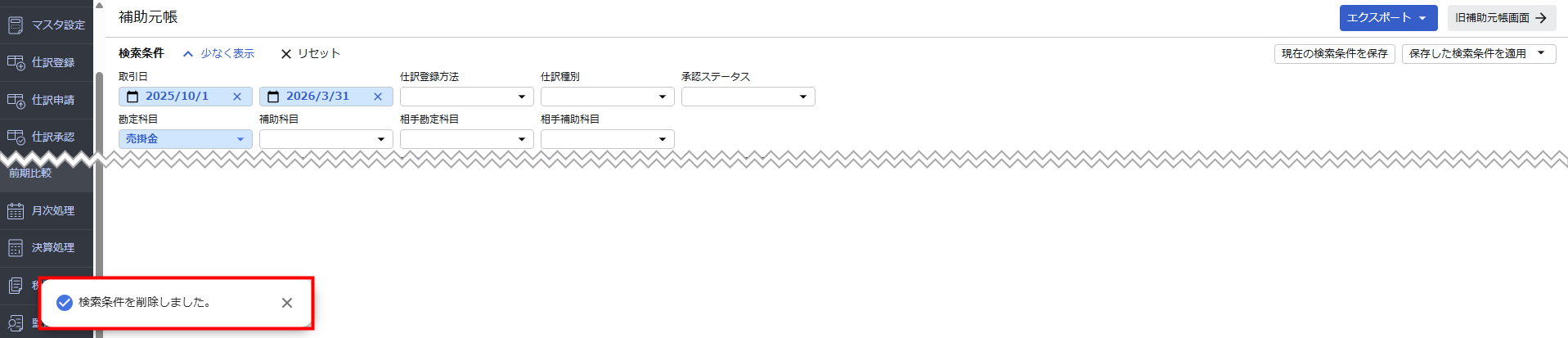 - 画面左下に「検索条件を削除しました。」というメッセージが表示されたことを確認します。