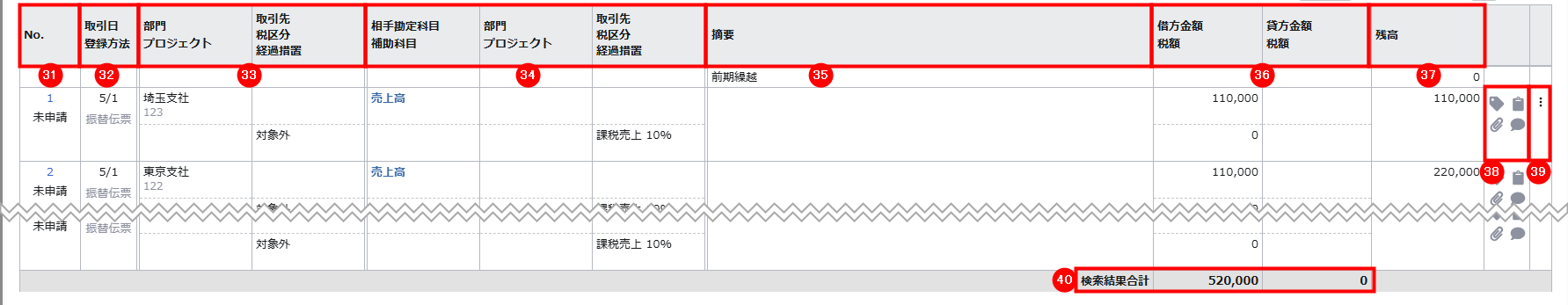 | ㊴ | 縦三点リーダー | クリックすると、「詳細」「編集」「逆仕訳」「複製」「他年度複製」の選択肢が表示されます。 | ㊵ | 検索結果合計 | 最終ページの最下部に検索結果の合計金額が表示されます。 |