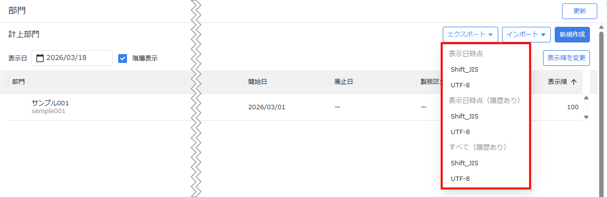| すべて | 廃止した部門や未来で利用する部門も含め、登録されているすべての部門を出力します。 |