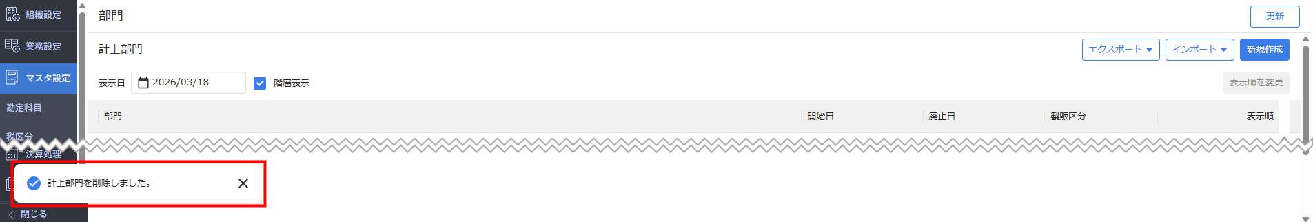 - 「計上部門を削除しました。」というメッセージが表示され、部門が削除されたことを確認します。