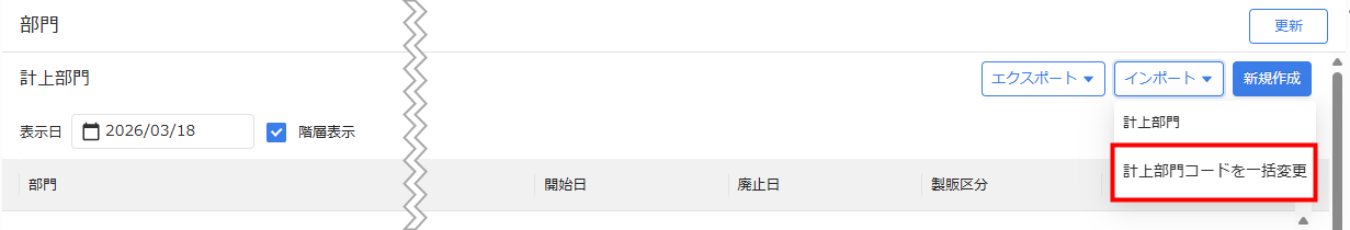 - 「部門」画面で「インポート」をクリックし、「部門コードを一括変更」を選択します。