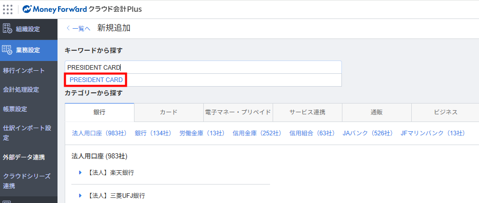 - 「金融機関登録」画面で「PRESIDENT CARD」をクリックします。