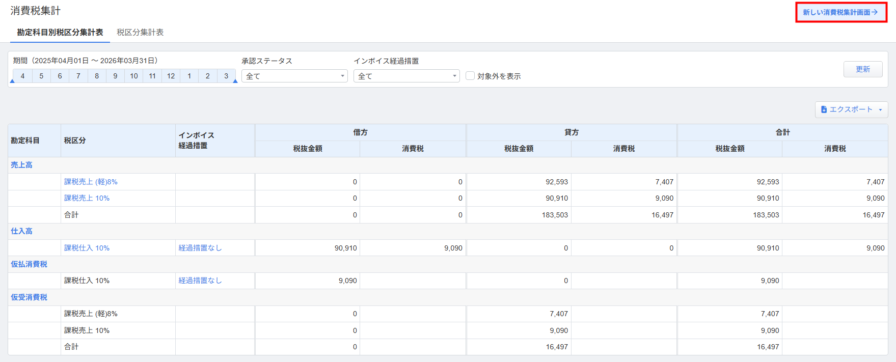 現在の「消費税集計」画面右上にある「新しい消費税集計画面」をクリックすると、リニューアル後の「消費税集計」画面へ切り替えられます。