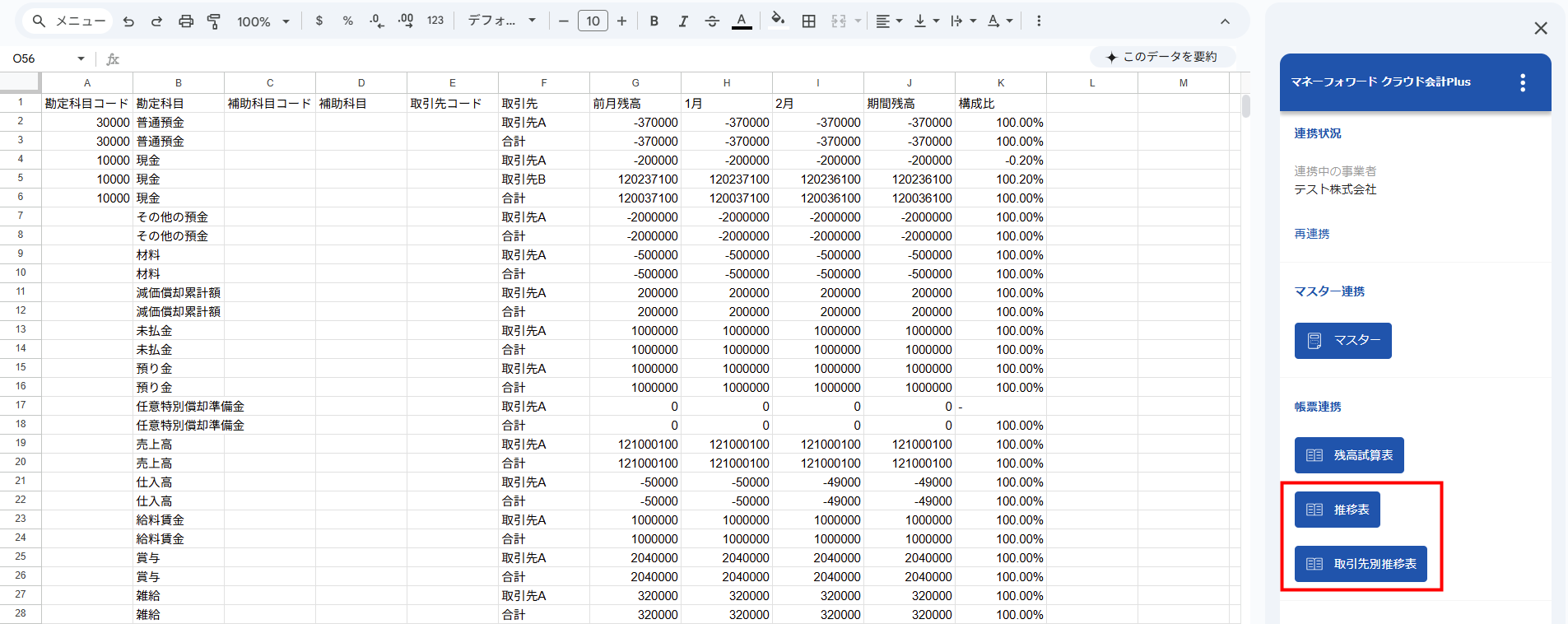 「スプレッドシート連携」機能で「推移表」画面や「取引先別推移表」画面のデータを取得できるようになりました。