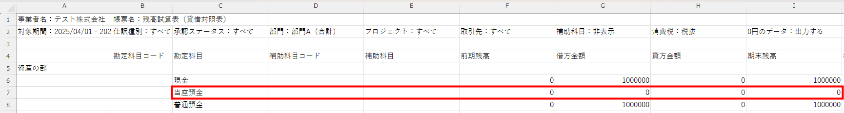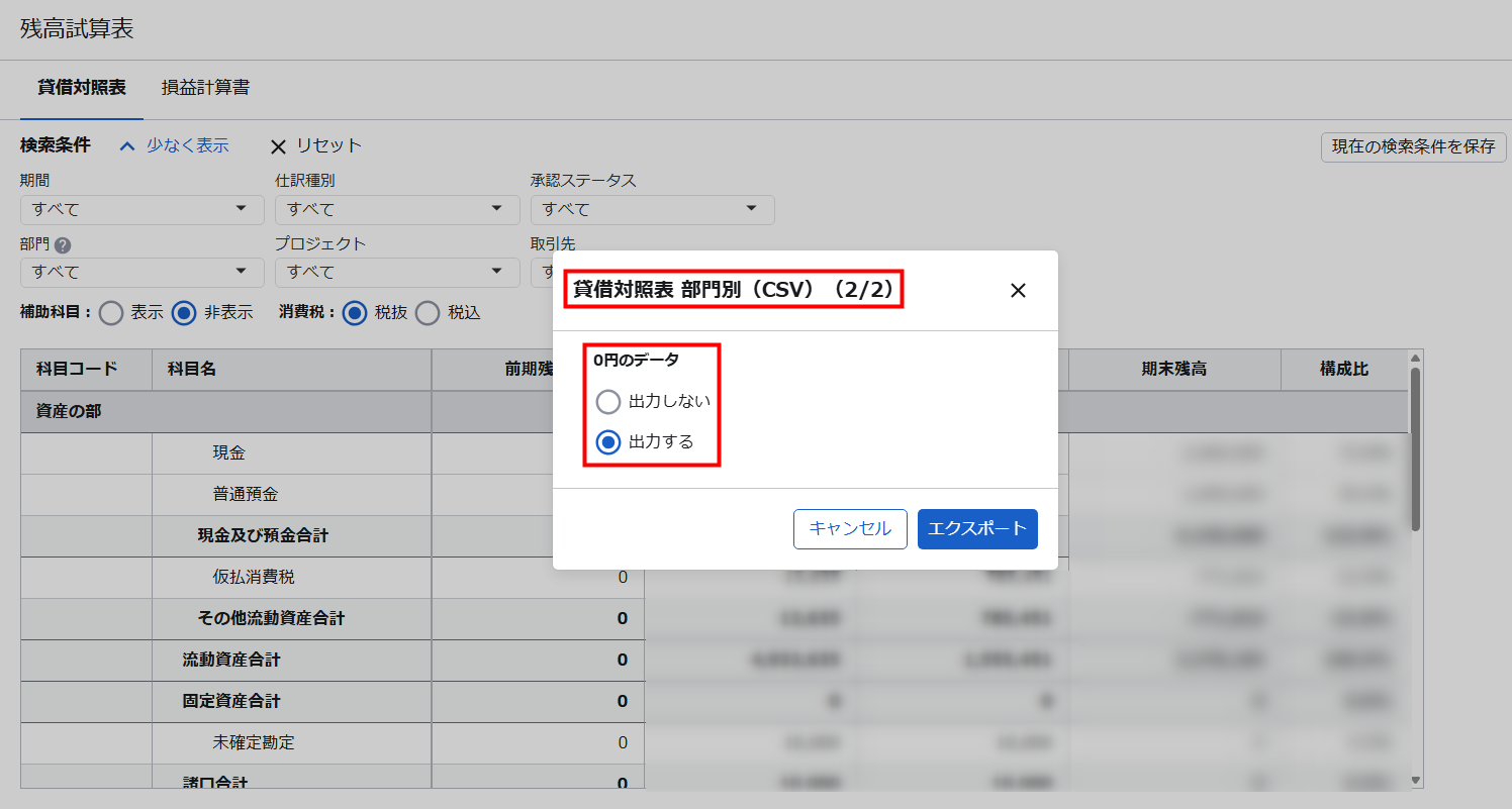 「残高試算表」画面と「推移表」画面において、部門別CSVファイルのエクスポート時に0円のデータを出力できるようになりました。