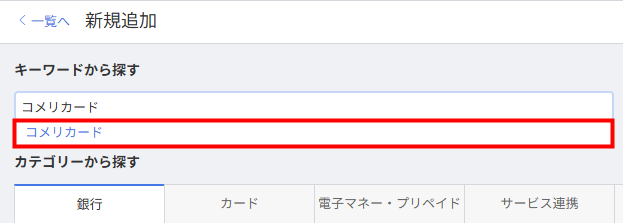 - 「キーワードから探す」の検索ボックスに「コメリカード」と入力し、表示された該当のサービスを選択します。