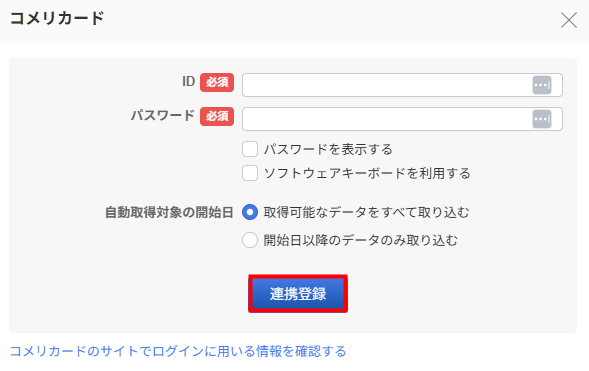- 「コメリカード」画面でアカウント情報を入力し、「連携登録」をクリックします。