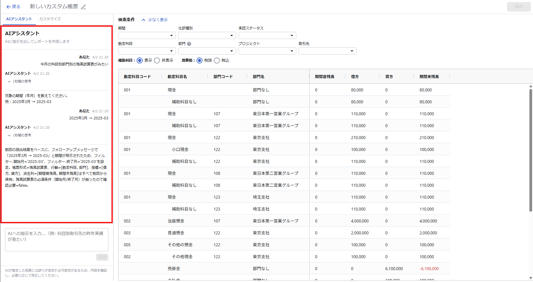 「AIアシスタント」を利用すると、AIエージェントへ依頼した内容をもとに帳票を生成できます。