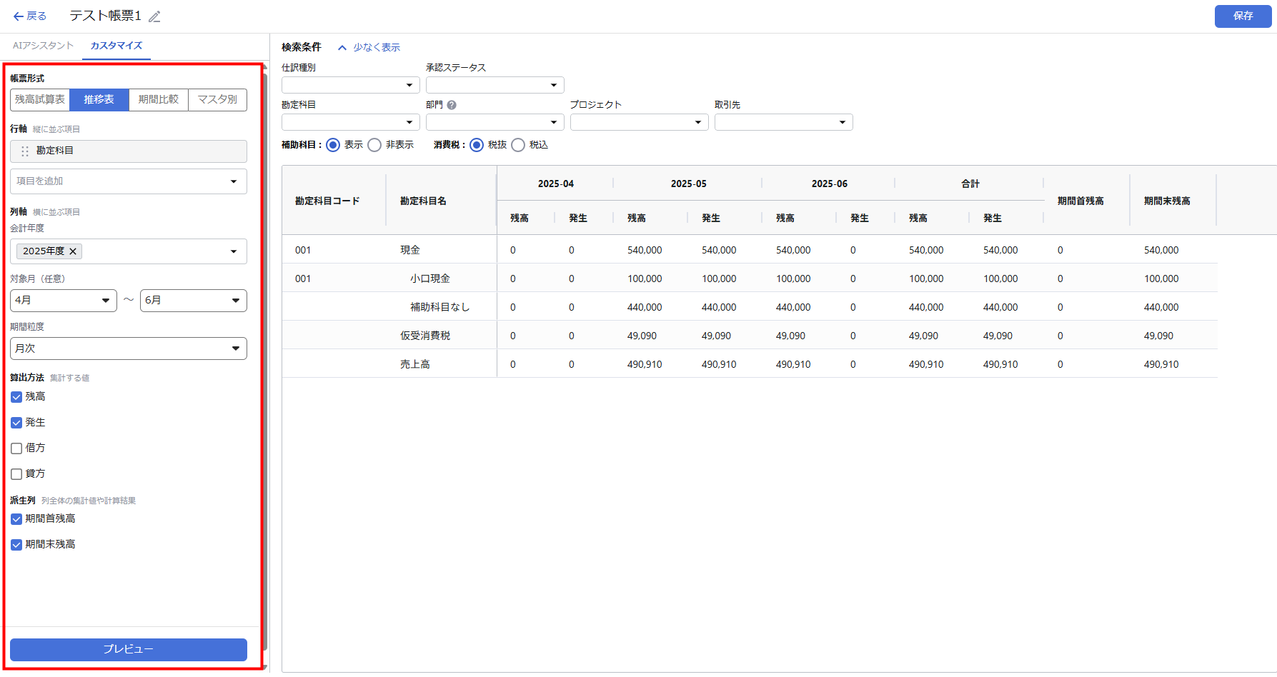 「カスタマイズ」を利用すると、「残高試算表」「推移表」「期間比較」「マスタ別」の帳票形式をもとに集計項目を選択し、独自の帳票を作成できます。