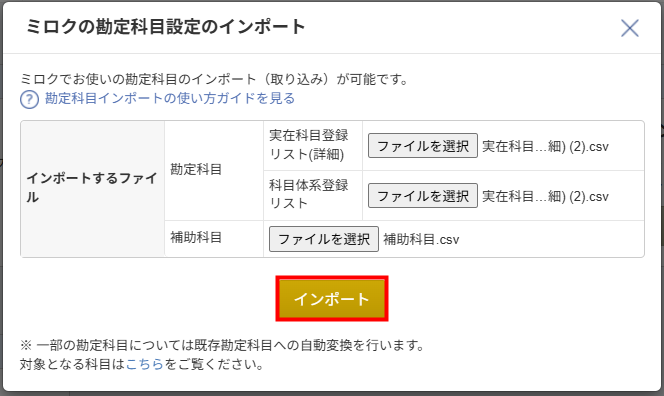 - 補助科目用の「科目別補助登録リスト」のアップロードは任意です。アップロードする場合は、必ず先に勘定科目用のファイルをアップロードしてください。