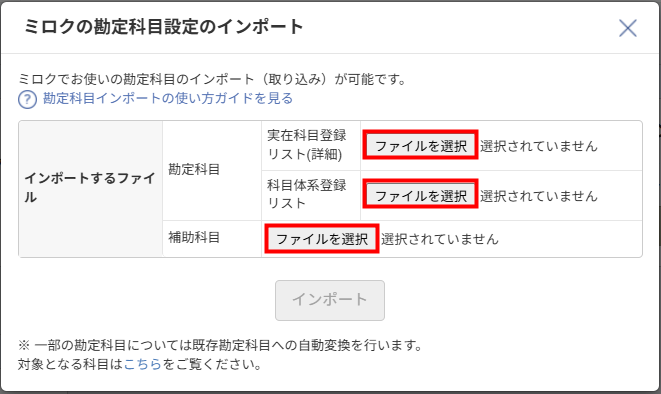 - 「ミロクの勘定科目設定のインポート」画面で「ファイルを選択」をクリックし、アップロードするファイルを選択します。