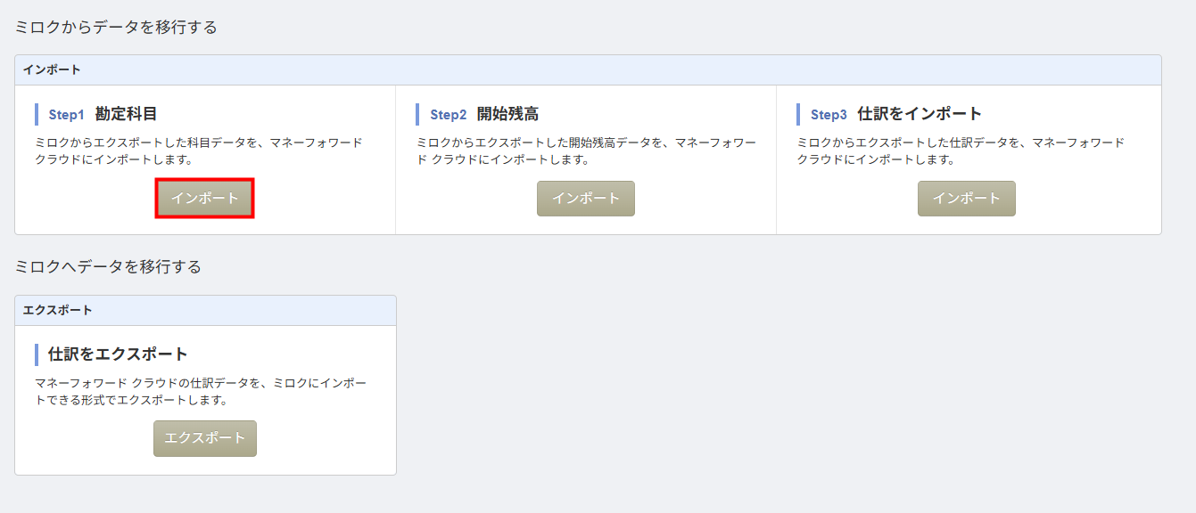 - 「各種設定」>「他社ソフトデータの移行」>「ミロク」画面で「Step1勘定科目」の「インポート」をクリックします。