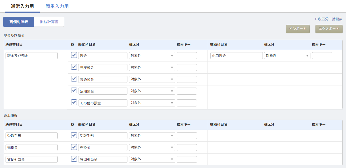 - 「各種設定」>「勘定科目」画面で勘定科目が正しくインポートされているかを確認します。
