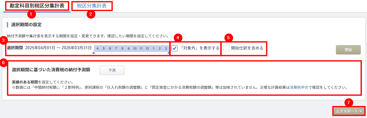 以下の手順では、「勘定科目別税区分集計表」タブで納税予測額を表示する場合を例に説明します。