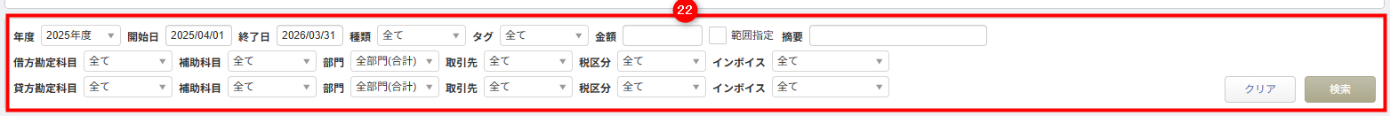 | ㉒ | 検索条件 | 登録した仕訳を検索できます。 |