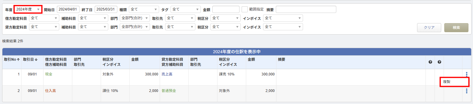 検索条件の「年度」で過年度を指定して検索すると、現在表示している会計年度に過年度の仕訳を複製することも可能です。