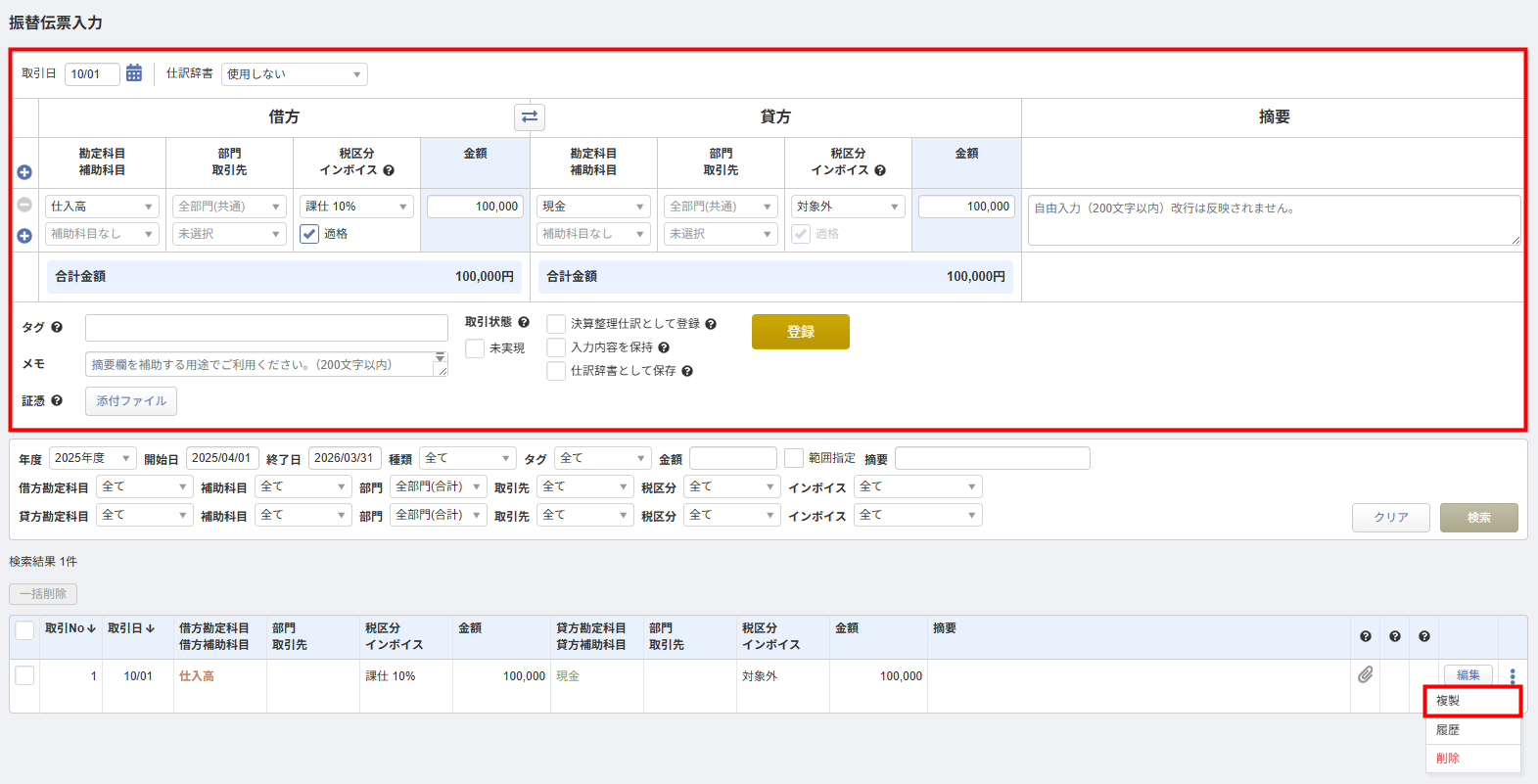 - 「手動で仕訳」>「振替伝票入力」画面上部の入力フォームで各項目を入力・選択します。