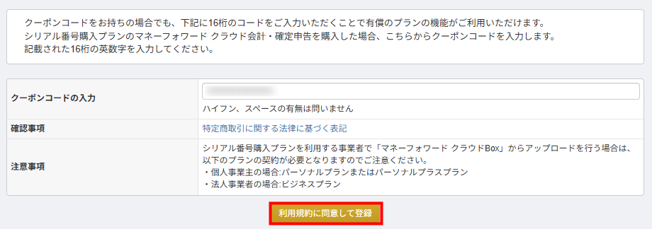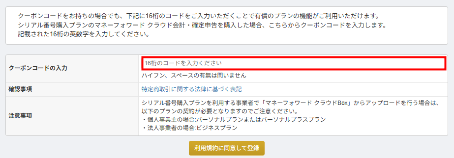 「クーポンコード」とは、マネーフォワード クラウド会計・確定申告やマネーフォワード クラウドの有償プランと同等の機能を利用できる16桁の英数字です。