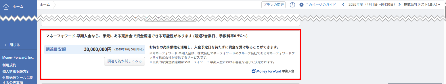 「資金調達の目安額を確認できるサポート機能」とは、マネーフォワード クラウド会計に登録されているデータをもとに、「マネーフォワード 早期入金」を利用した場合に調達可能な目安金額を自動算出する機能です。