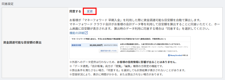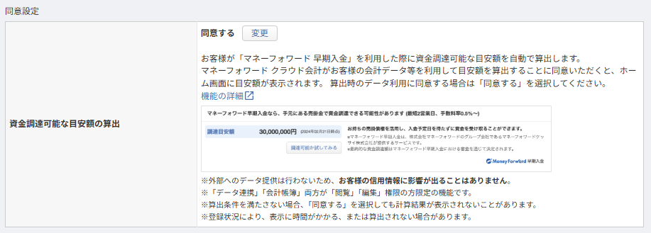 「資金調達の目安額を確認できるサポート機能」を利用するためには、「同意設定」でマネーフォワード クラウド会計に登録されている会計データを利用して目安金額を算出することに同意する必要があります。
