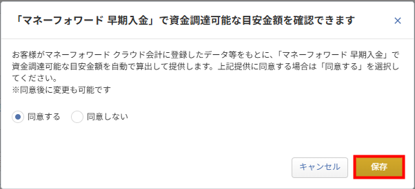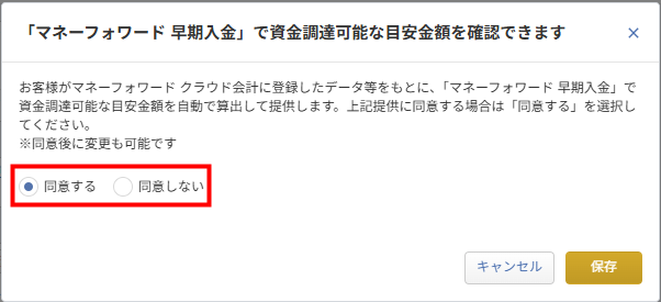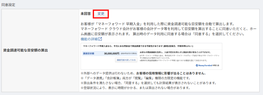 「同意設定」では、「マネーフォワード 早期入金」で調達可能な目安金額を自動で算出して提供することに同意するかどうかを設定できます。